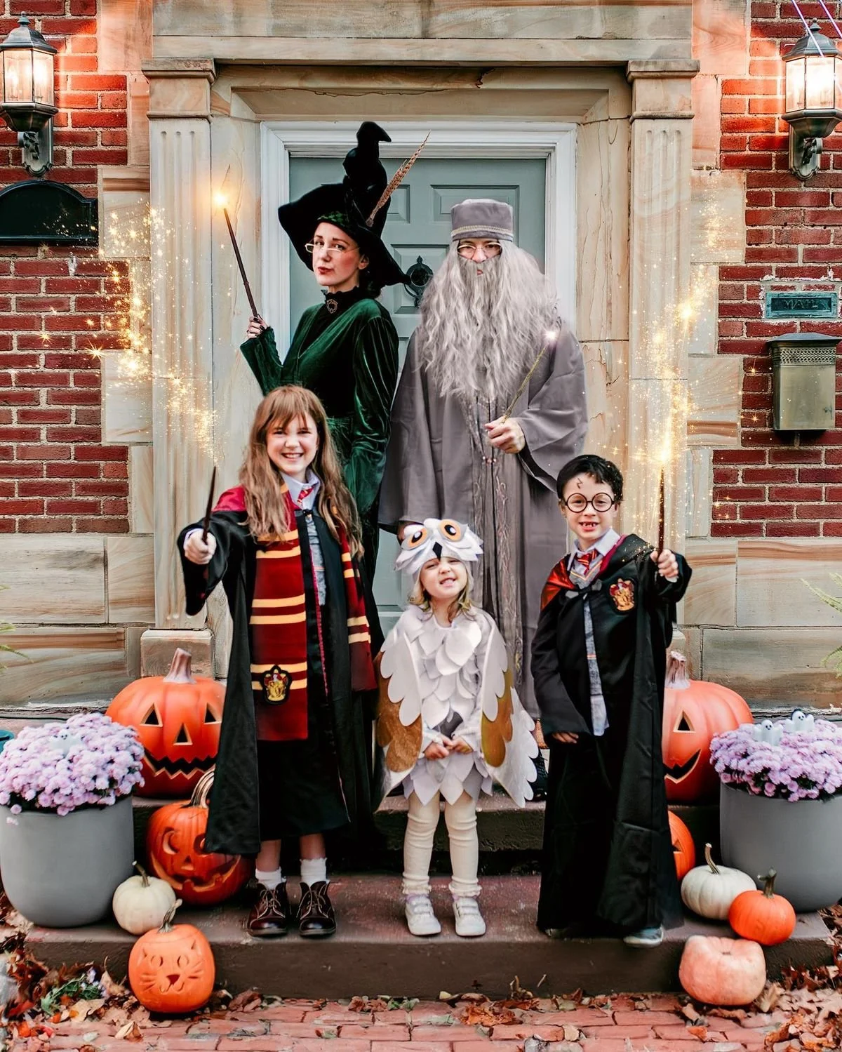 Look: jersey escolar, corbata por casa, capa negra y varita.